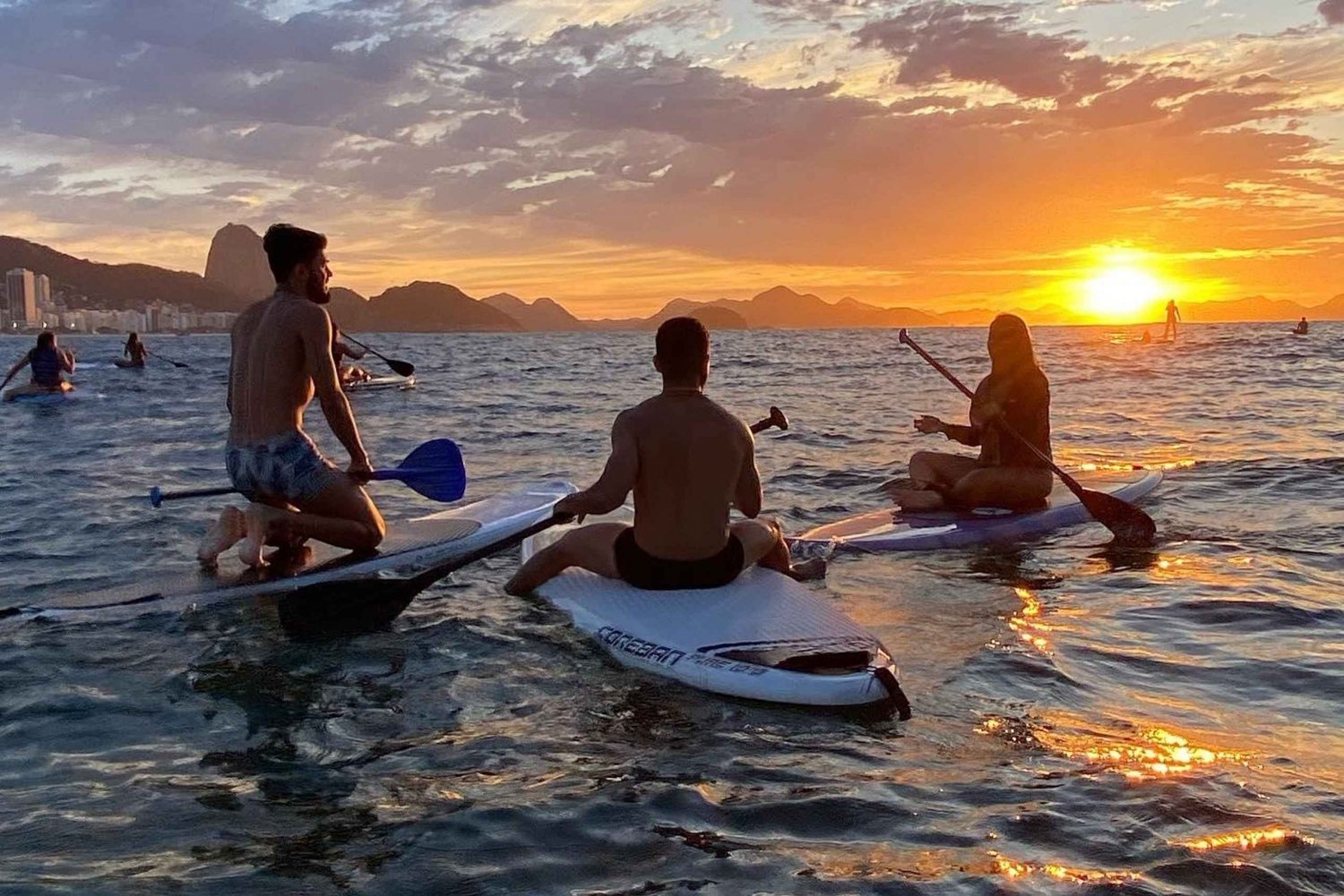 Viva a magia do amanhecer em Copacabana em uma experiência privativa de Stand Up Paddle. Navegue pelas águas calmas da orla enquanto o sol se levanta, iluminando o Pão de Açúcar, o Forte de Copacabana e o Cristo Redentor ao fundo.